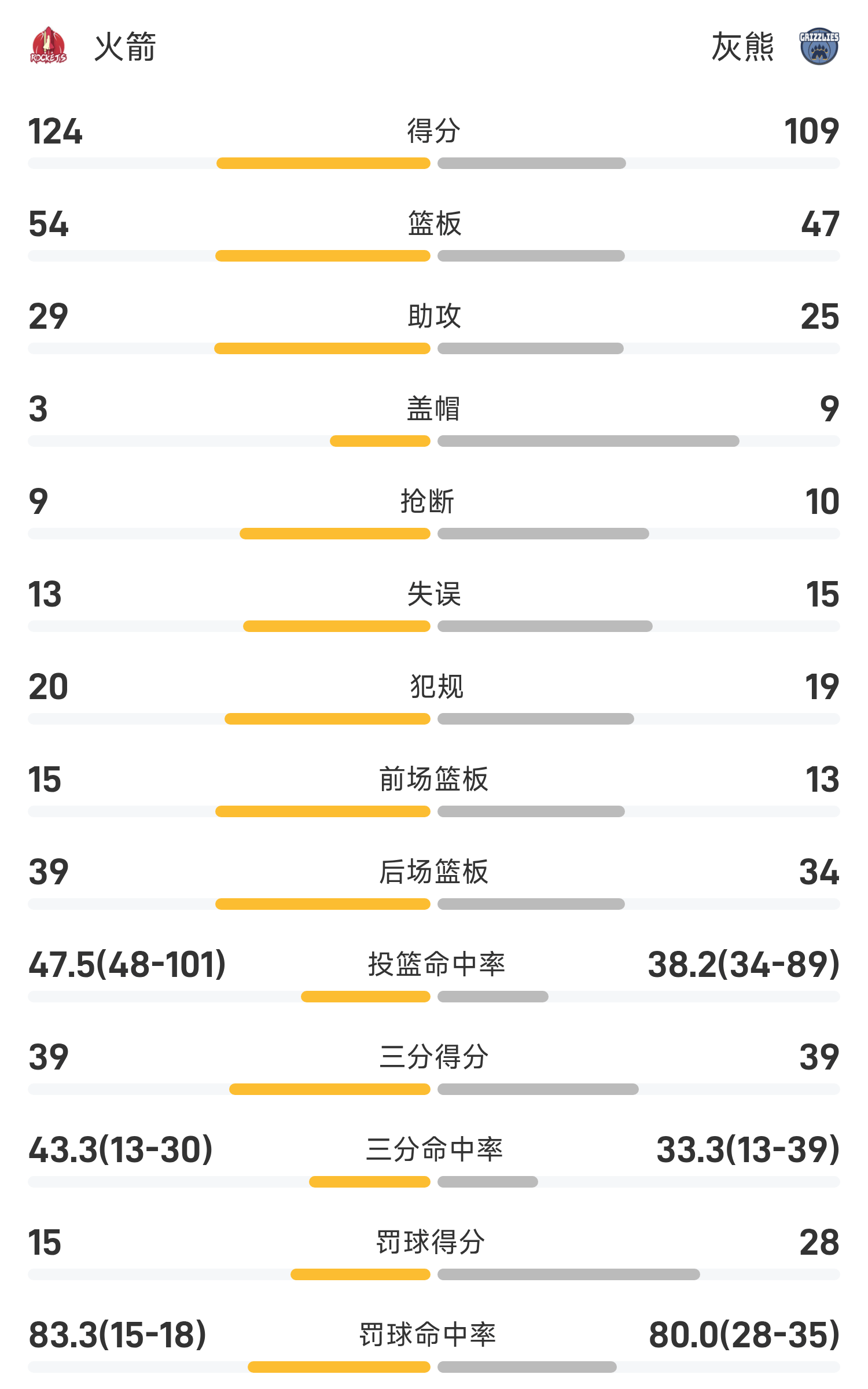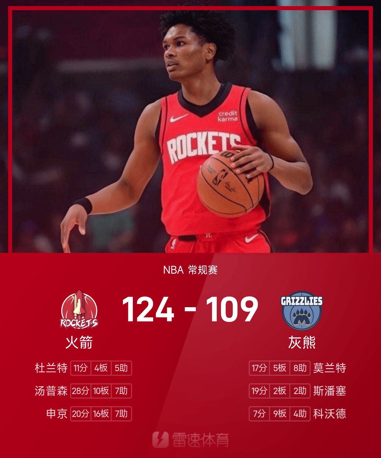 6686体育11月06日讯 25/26赛季NBA 常规赛,灰熊对阵火箭。双方全场战罢,灰熊109-124不敌火箭。阿门·汤普森砍下全场最高的28分10板7助,率领火箭胜利取胜。