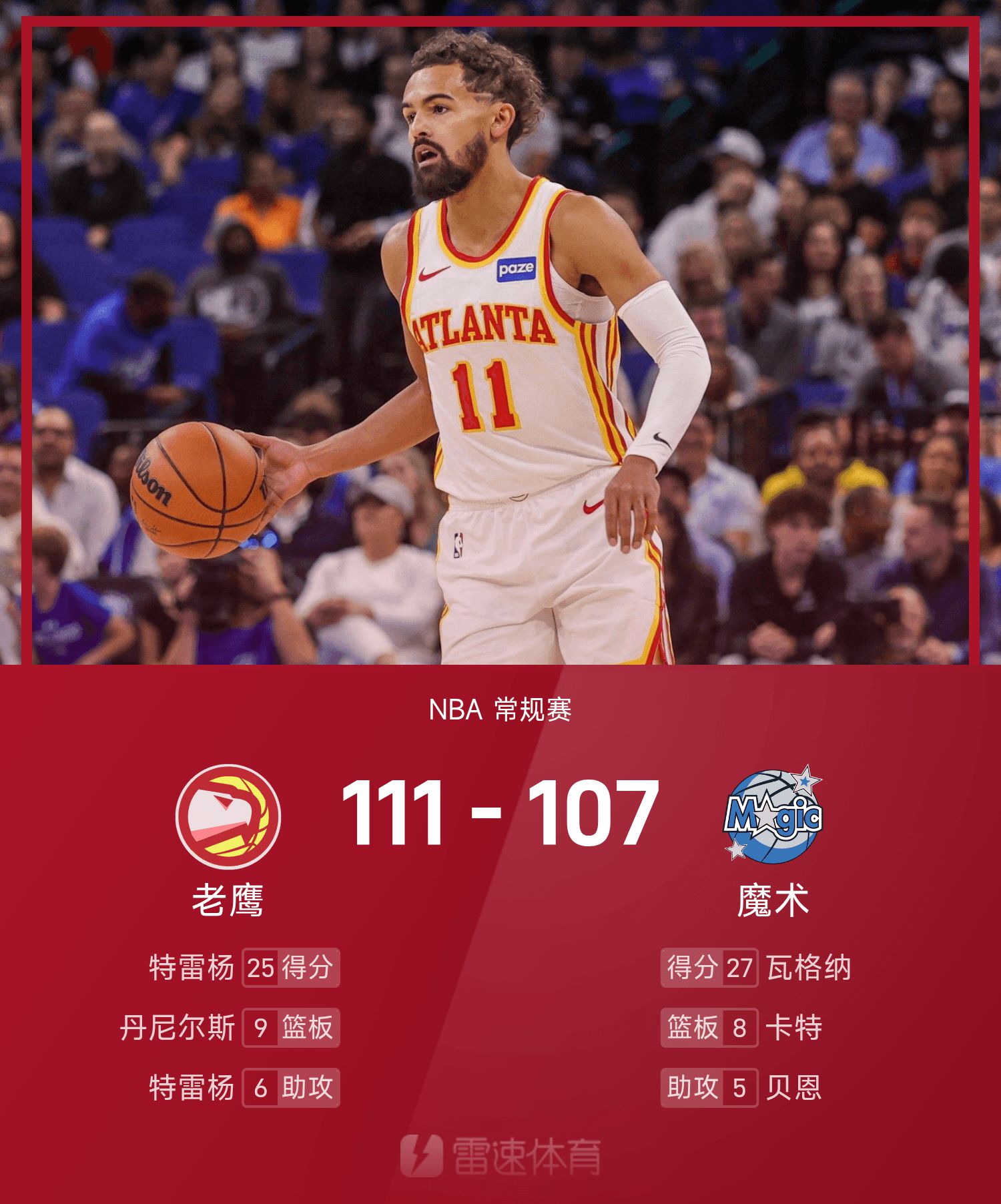 特雷·杨18投7中,得到25分1抢篮板6助攻。