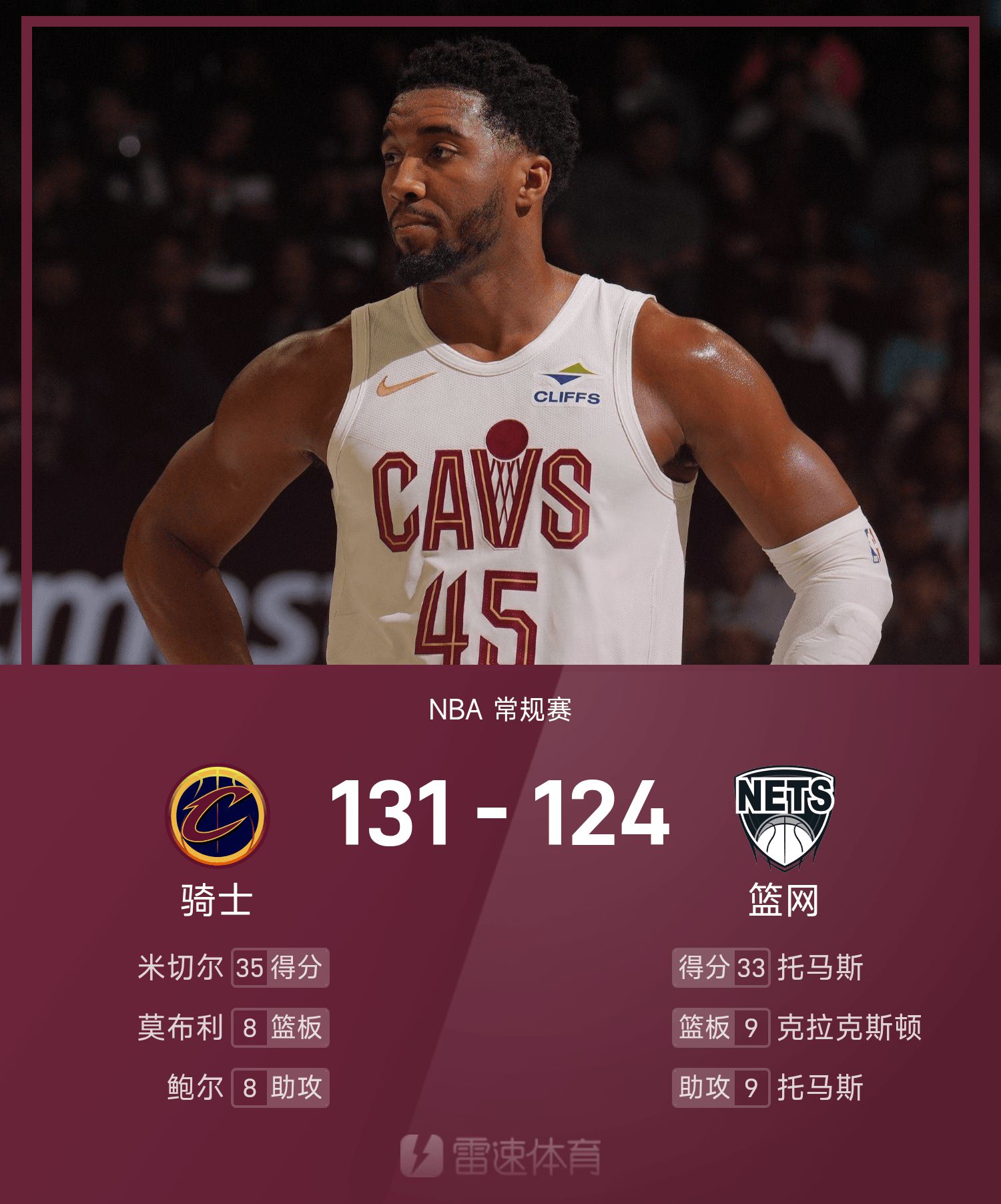 米切尔15投10中,得到35分2抢篮板5助攻。
