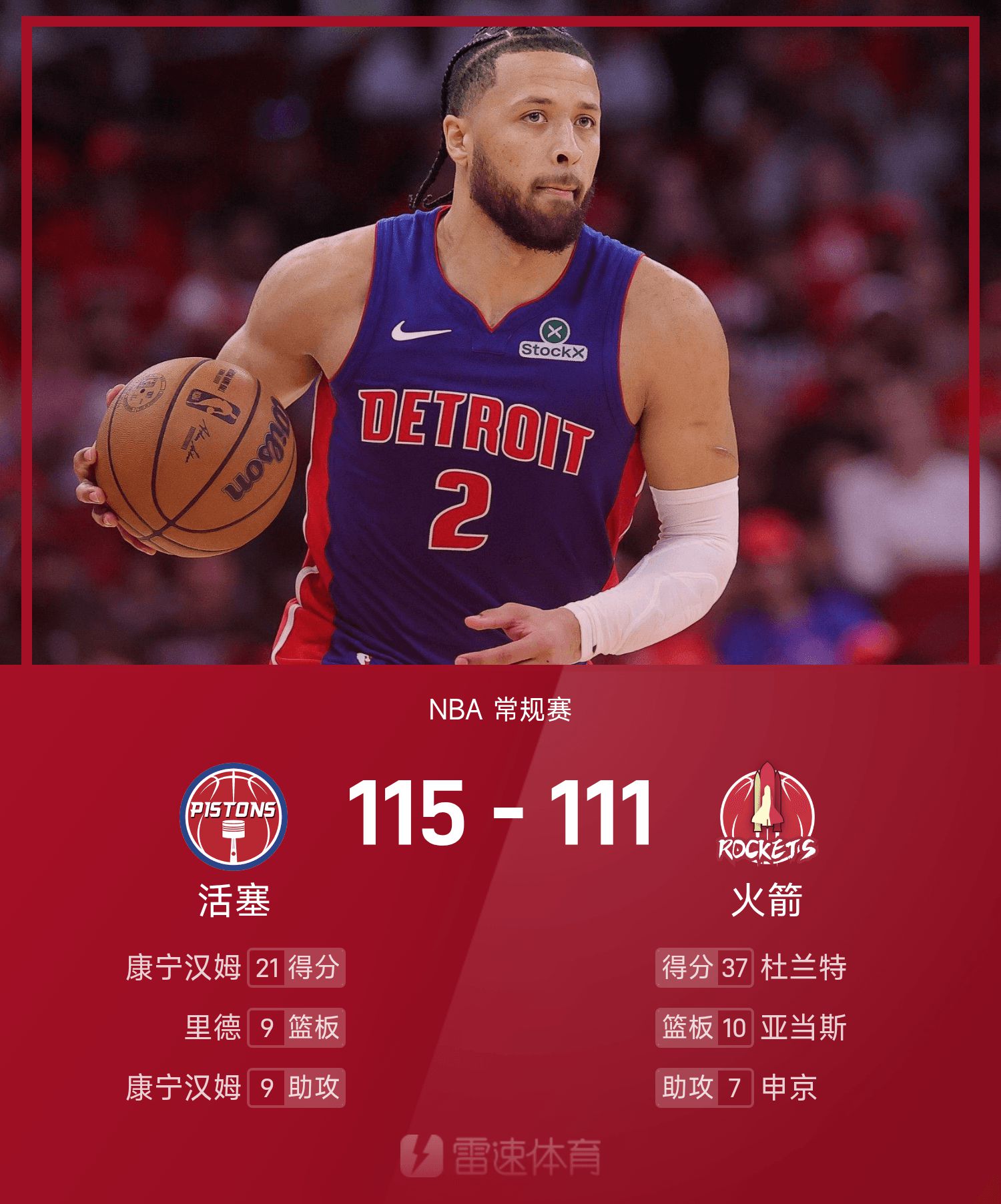 康宁汉姆16投7中,得到21分7抢篮板9助攻。