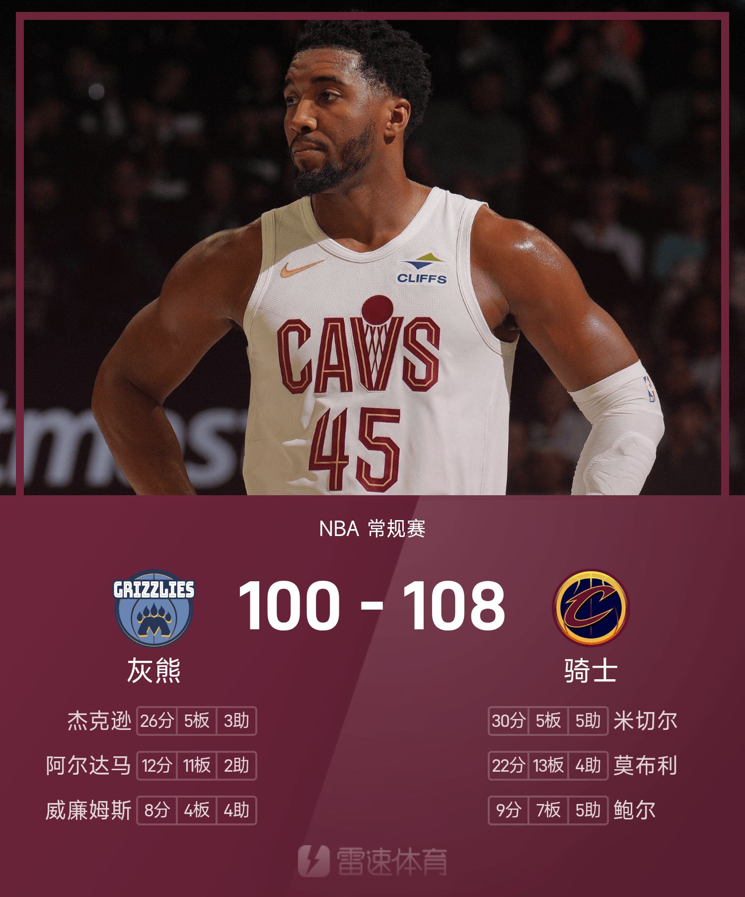 NBA战报:米切尔30+5+5,骑士108-100逆转灰熊