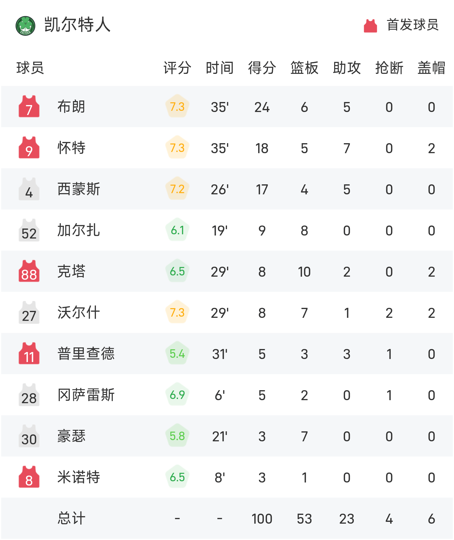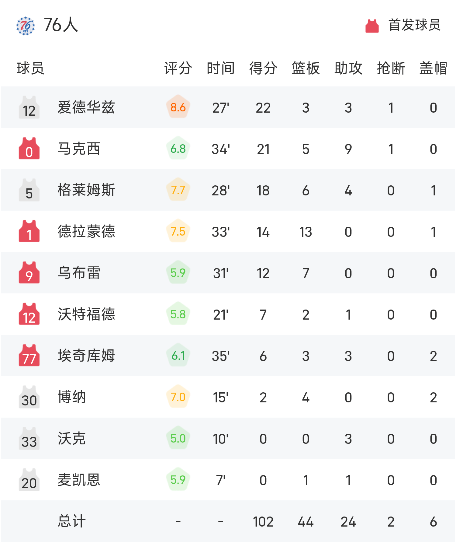 双方全场战罢,76人102-100战胜凯尔特人。