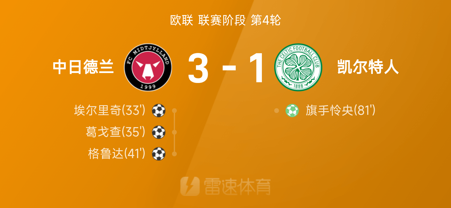 6686体育11月07日讯 25/26赛季欧联联赛事阶段第4轮,中日德兰3-1战胜凯尔特人。全场竞赛,葛戈查发挥出色贡献1射1传,格鲁达、埃尔里奇破门建功,旗手怜央破门难救主。