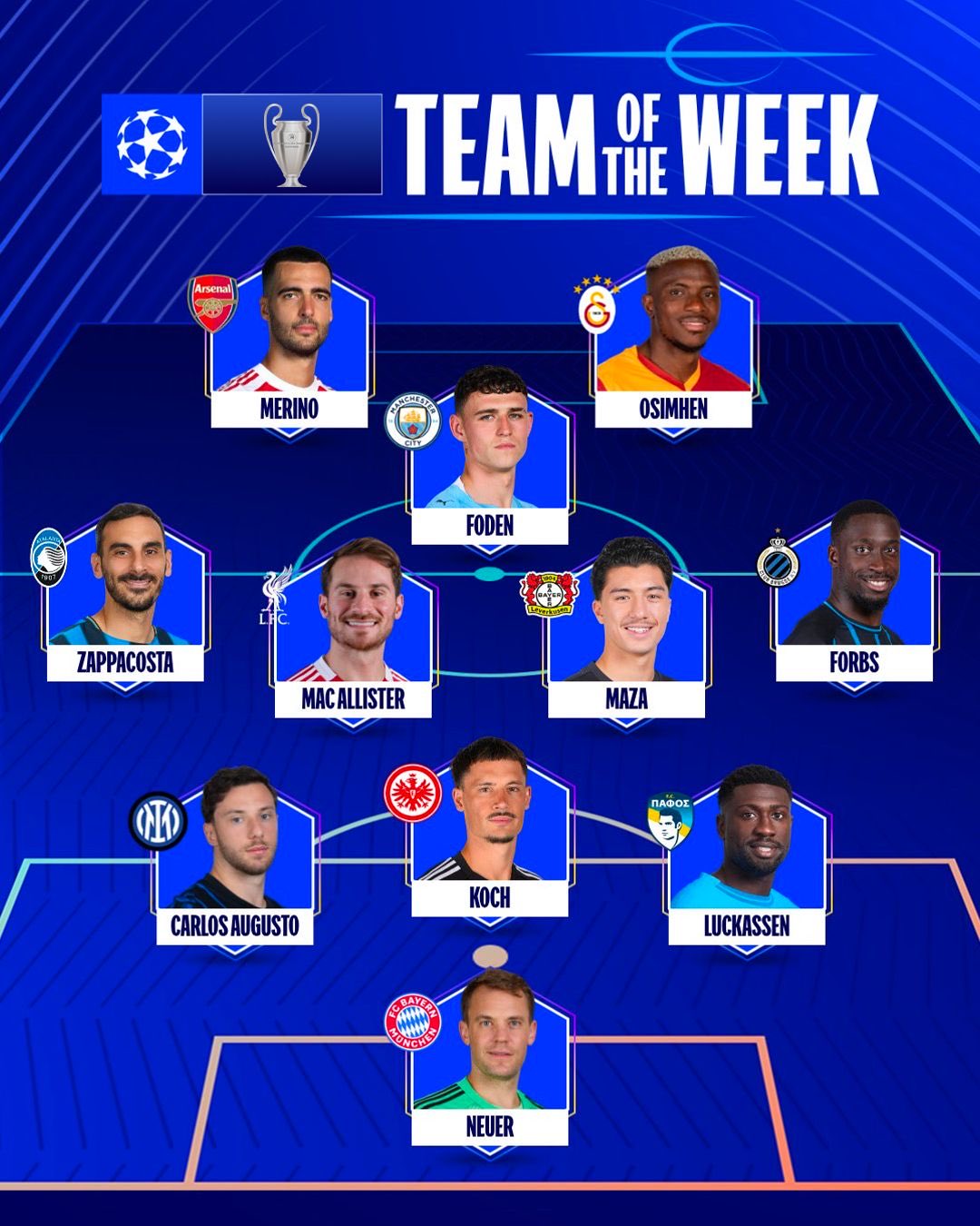 6686体育11月7日讯 欧足联官方公布了联赛事阶段第四轮的周最佳阵容,奥斯梅恩、诺伊尔领衔该榜单,福登、麦卡利斯特、梅里诺在列。