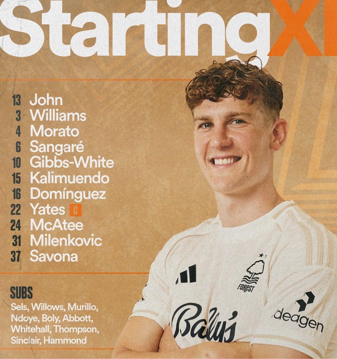 诺丁汉森林首发阵容:13-维克托、31-米伦科维奇、3-威廉姆斯、4-莫拉托、37-萨沃纳、6-桑加雷、22-耶茨、10-怀特、16-多明格斯、24-麦卡蒂、15-卡利穆恩多