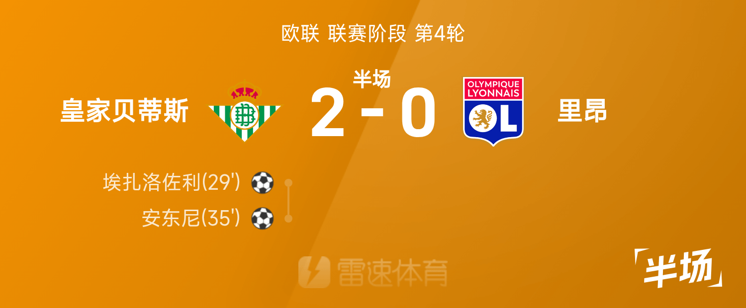 欧联半场:安东尼单刀破门,皇家贝蒂斯暂2-0里昂