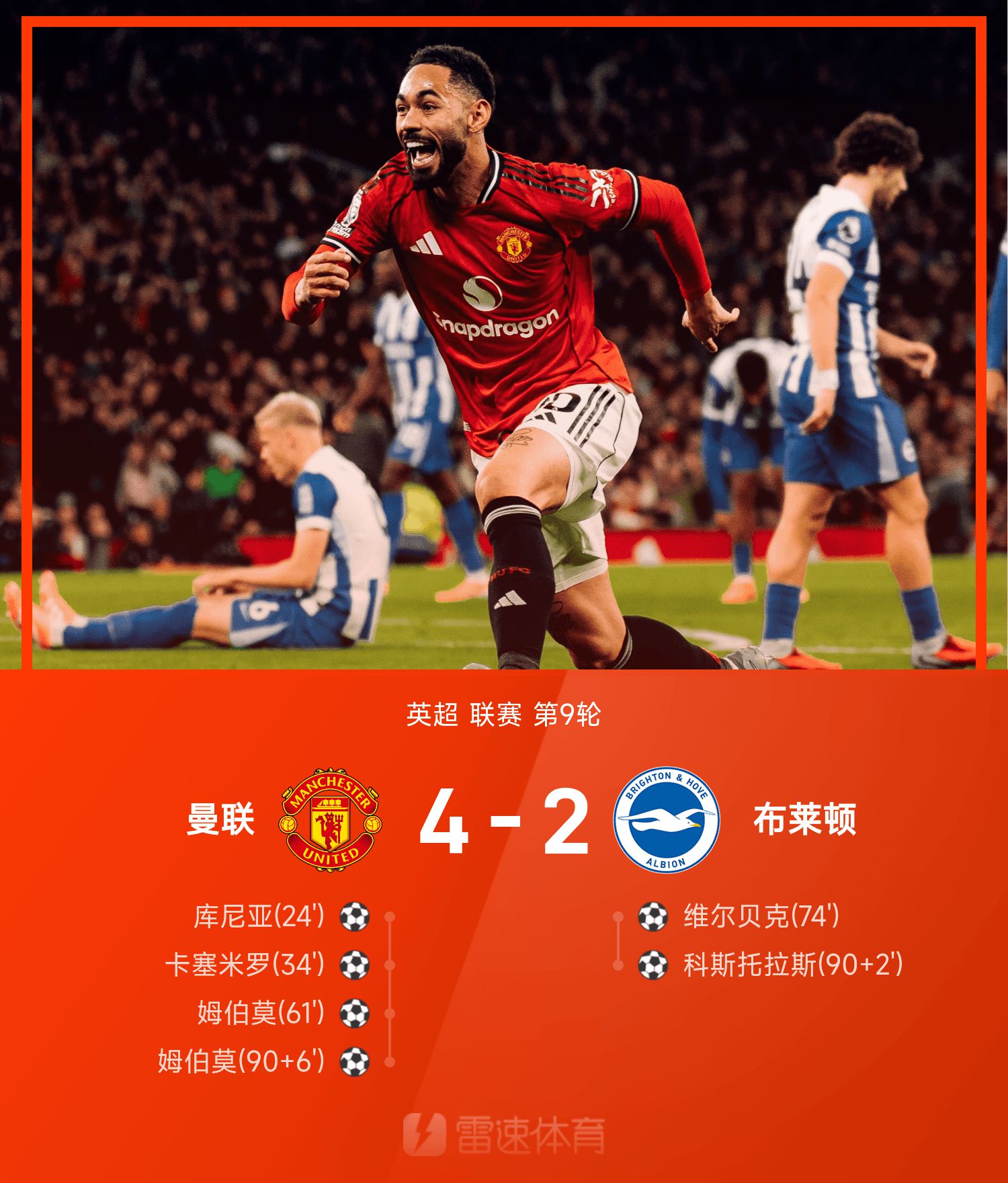 英超战报:库尼亚破门,姆伯莫双响,曼联4-2布莱顿迎三连胜