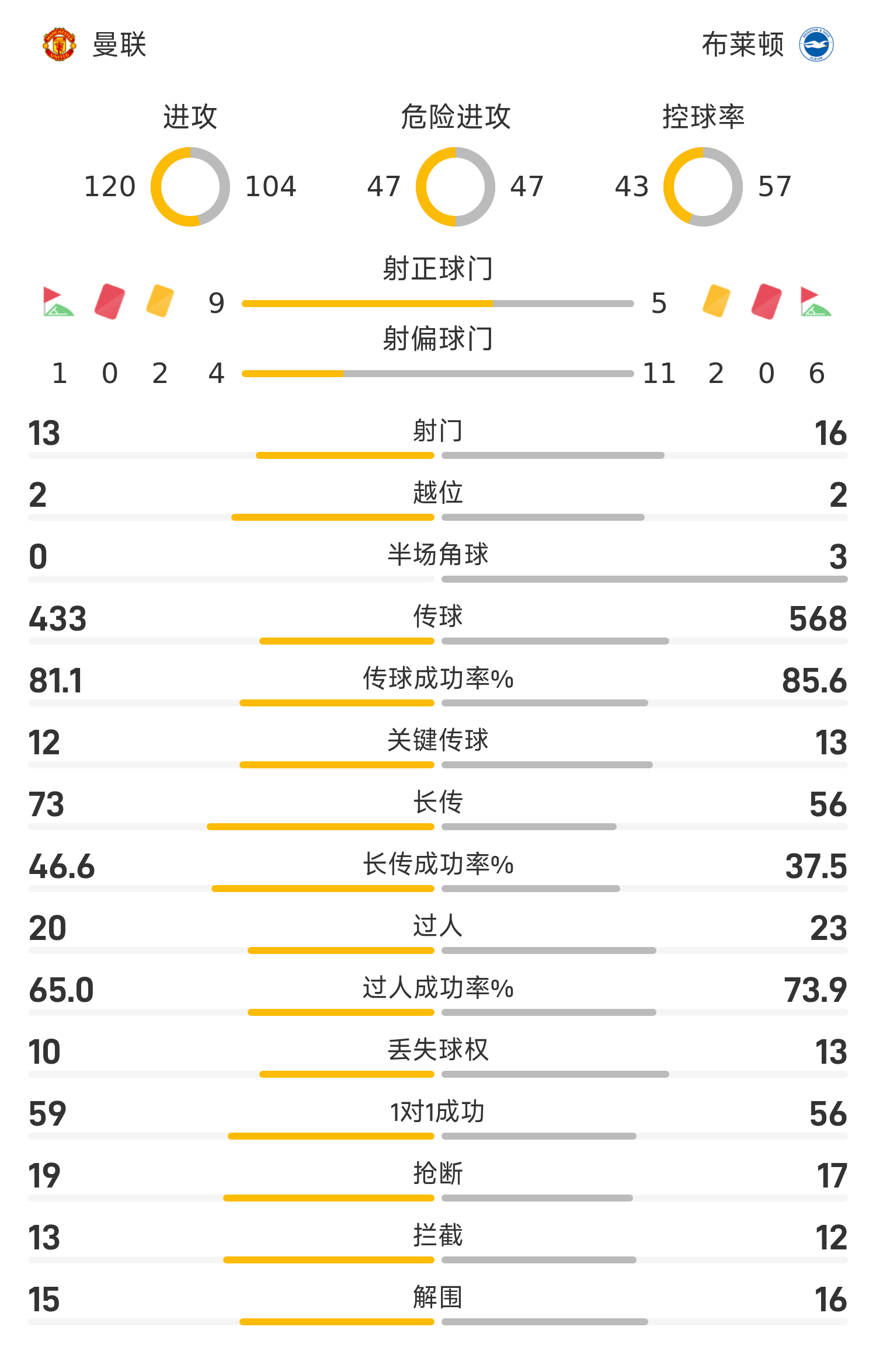48’B费六码线上抽射被费布鲁亨下意识挡出,曼联仍2-0布莱顿