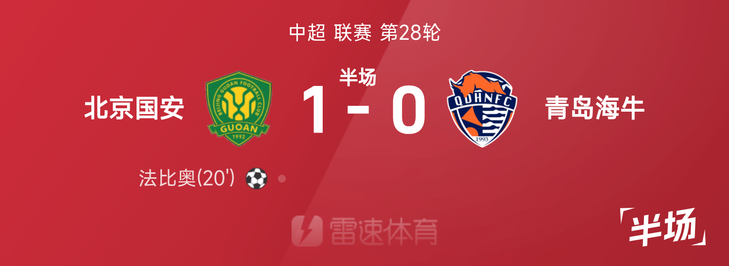 中超半场:达万助攻,法比奥破门,北京国安1-0青岛海牛