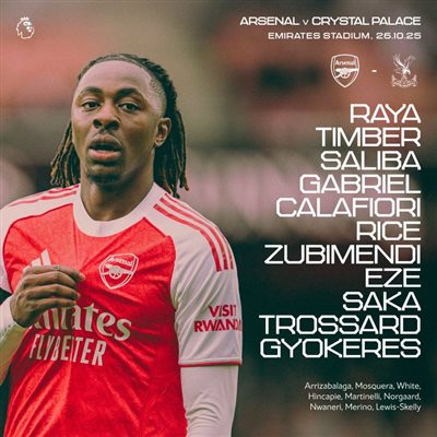6686体育10月26日讯 英超联赛事第9轮,阿森纳主队场迎战水晶宫。赛前,两队首发阵容出炉。