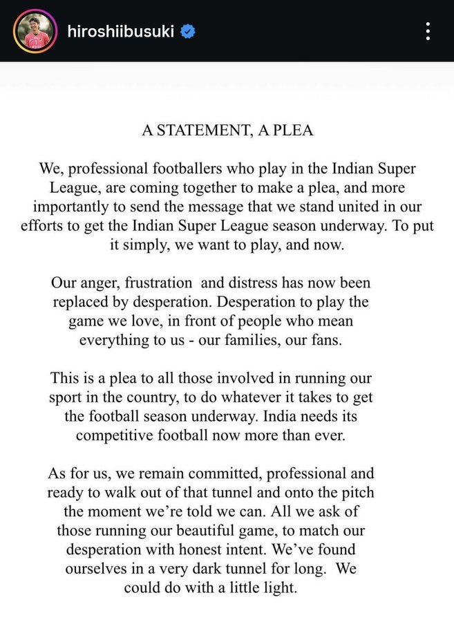 “起初的气愤、沮丧与痛苦,如今已被绝望取代。我们迫切期望在家人和球迷面前,重新奔跑在我们挚爱的绿茵场上。我们恳请所有负责管理印度足球的人士,尽一切勤奋让新赛季尽快开端。现在的印度,比以往任何时候都更需要真正的职业足球。”
